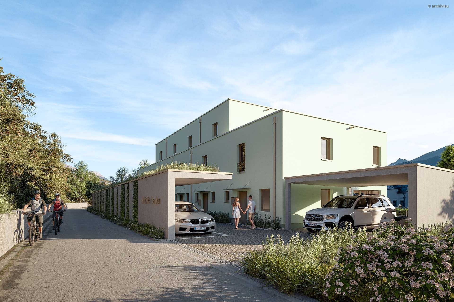Zur gehobenen Ausstattung zählen elektrisch betriebene Rollläden, großzügige Fensterflächen, eine Vorbereitung für Errichtung von E-Ladestationen sowie insgesamt zehn Carportstellplätze mit Zufahrt von der Nordseite. Ein gemeinsamer Fahrrad- und Müllraum rundet das durchdachte Gesamtkonzept ab.