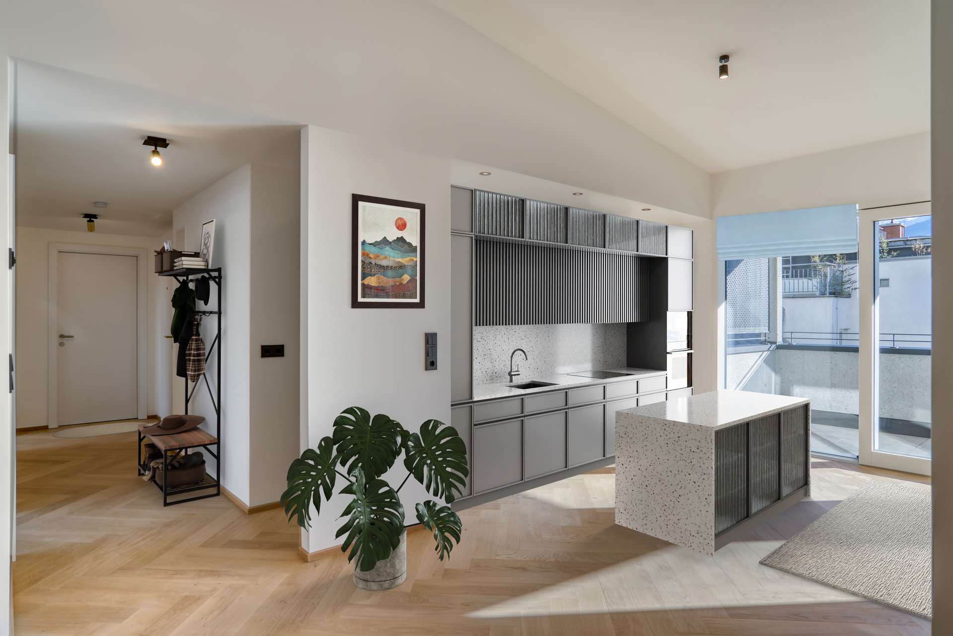 Die zwei Penthäuser überzeugen mit ihren großen Deckenfenstern und der gemütlichen Atmosphäre. Geräumige und helle Räume laden hier zum Wohlfühlen ein. Die südwestlich ausgerichteten Terrassen verschaffen Ihnen einen traumhaften Blick auf die umliegende Bergkulisse und den grünen, ruhig gelegenen Innenhof. Im Winter sorgt die Fußbodenheizung für warme Temperaturen im Penthouse während im Sommer eine moderne Deckenkühlung ein angenehmes Raumklima schafft.