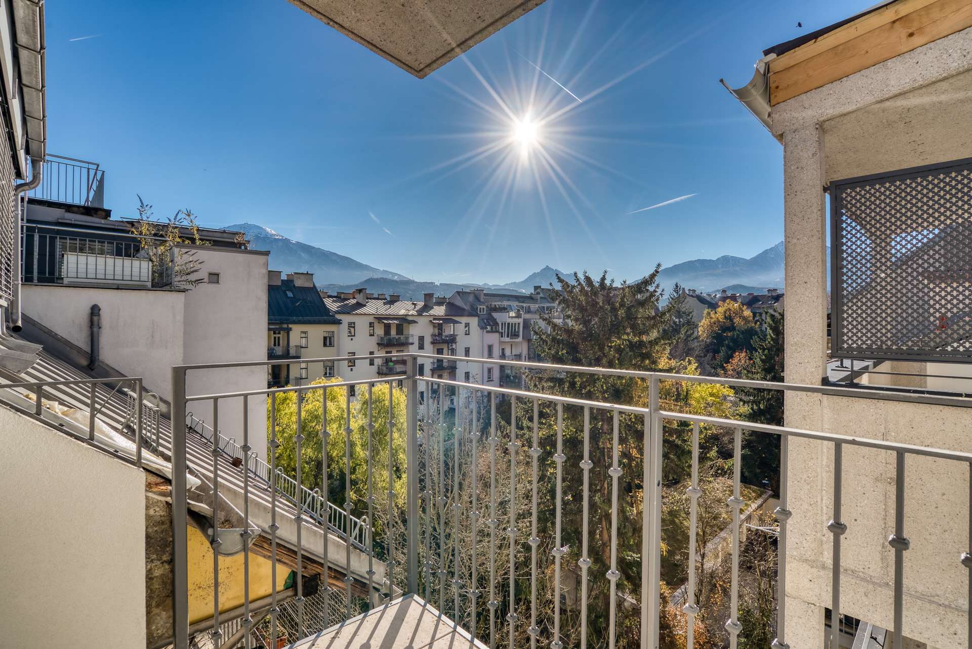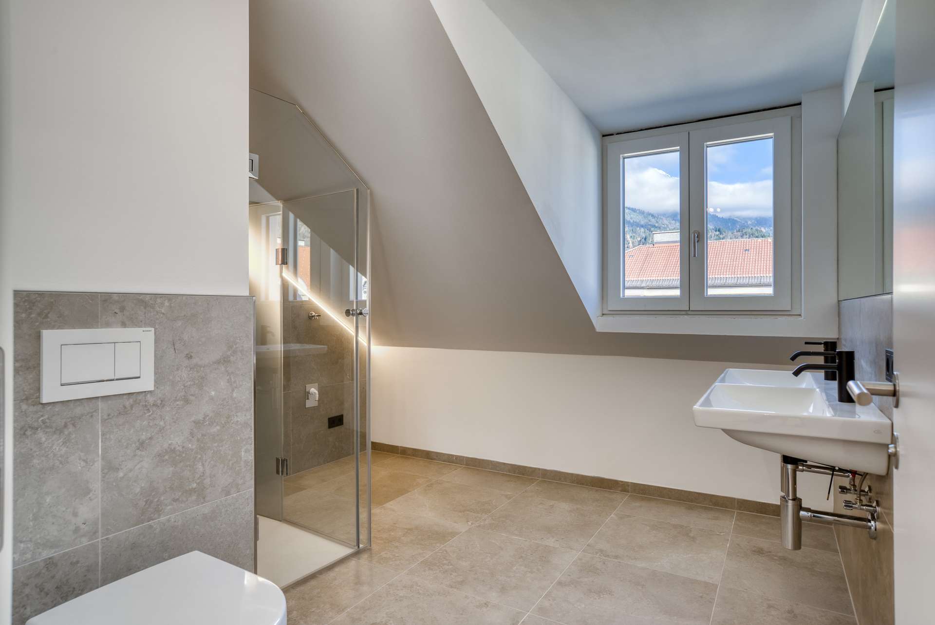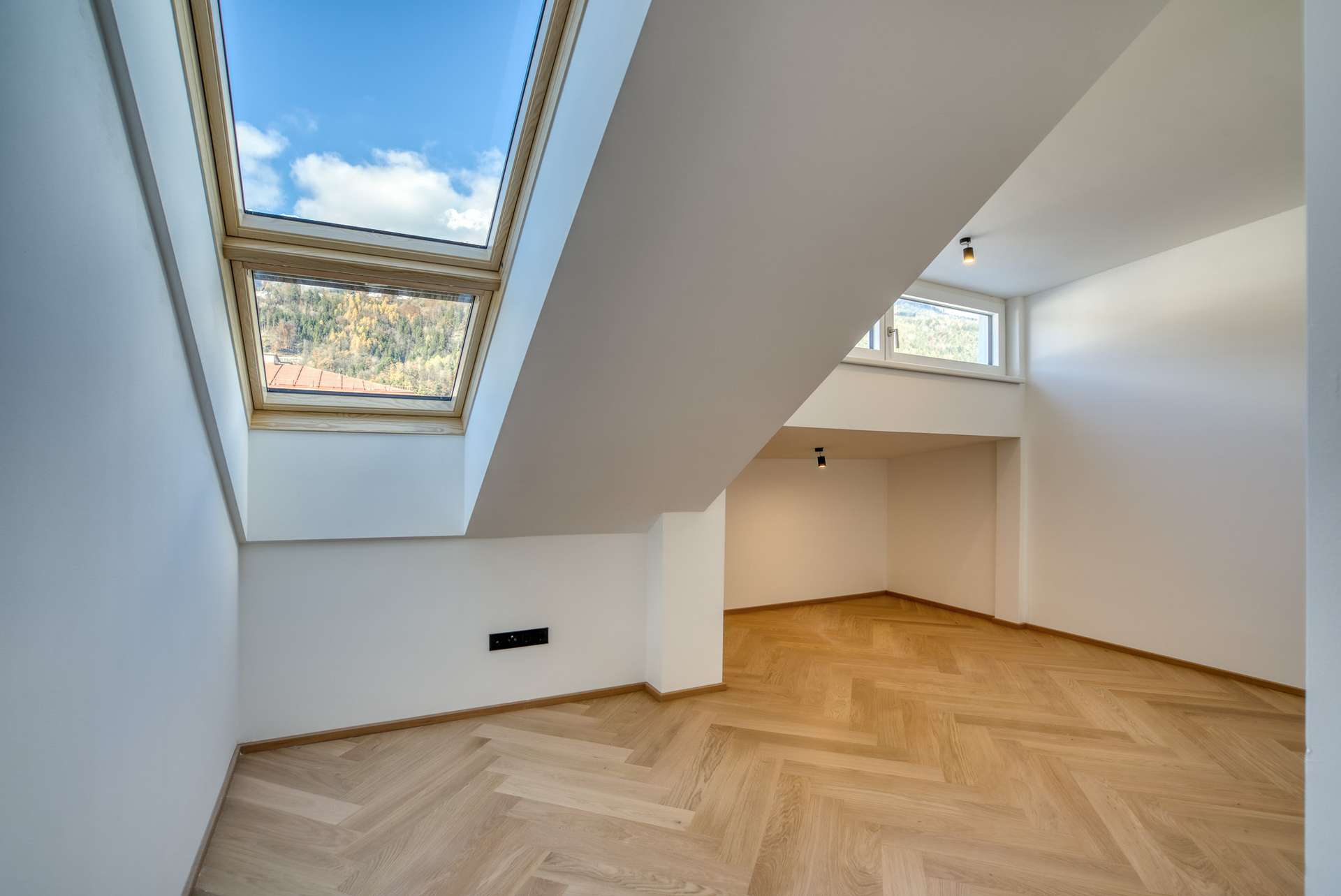 Die zwei Penthäuser überzeugen mit ihren großen Deckenfenstern und der gemütlichen Atmosphäre. Geräumige und helle Räume laden hier zum Wohlfühlen ein. Die südwestlich ausgerichteten Terrassen verschaffen Ihnen einen traumhaften Blick auf die umliegende Bergkulisse und den grünen, ruhig gelegenen Innenhof. Im Winter sorgt die Fußbodenheizung für warme Temperaturen im Penthouse während im Sommer eine moderne Deckenkühlung ein angenehmes Raumklima schafft.