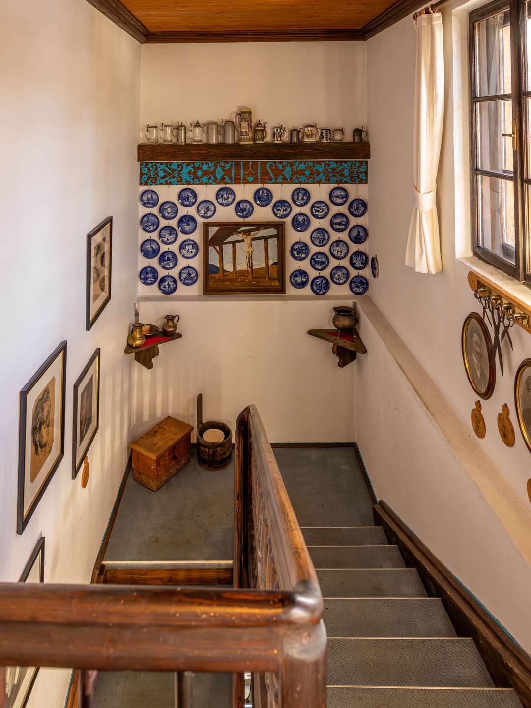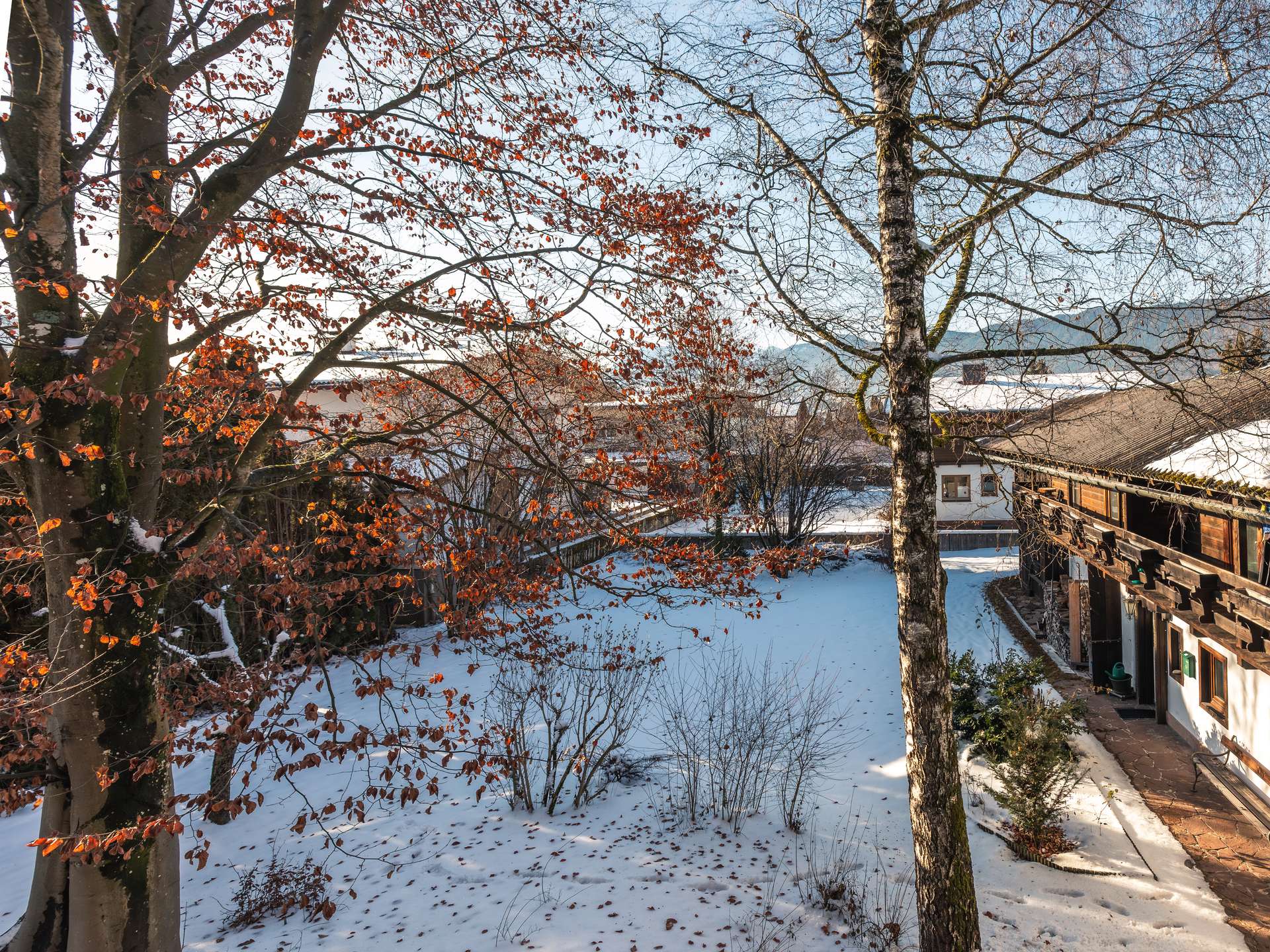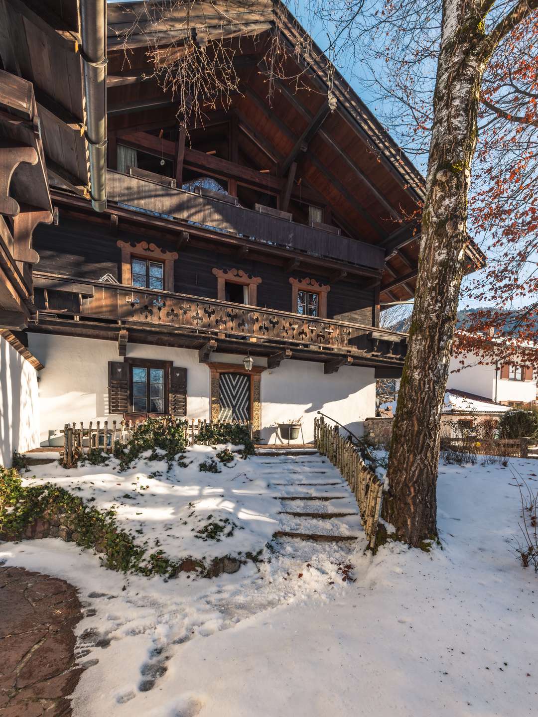 An allen Seiten ist das Landhaus vom eigenen Garten umgeben und im ersten Obergeschoß rundherum mit einem hölzernen Balkon versehen.